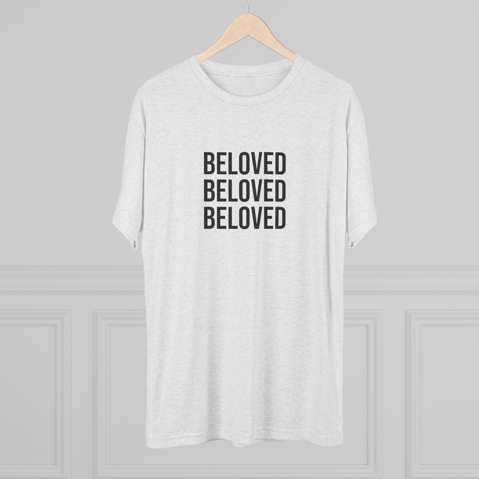 Insprited by the moments of the wonderful reminder in the poem "Beioved Is Where We Begin" by Jan Richardson. This soft, subtle, and quietly confident — this tri-blend crew brings a gentle, everyday comfort with a message that lingers. The minimalist front print repeats “BELOVED” in a clean, tall type, creating a calm, meditative pulse across the chest. Lightweight drape and a soft hand make it easy to layer under a jacket or wear alone on warm mornings. It’s the kind of tee someone reaches for when they want to feel seen and steady: breathy fabric, a relaxed regular fit, and a restrained design that speaks in whispers rather than shouts. Wear it to slow mornings, neighborhood walks, low-key gatherings, or when you want a quiet reminder of worth.